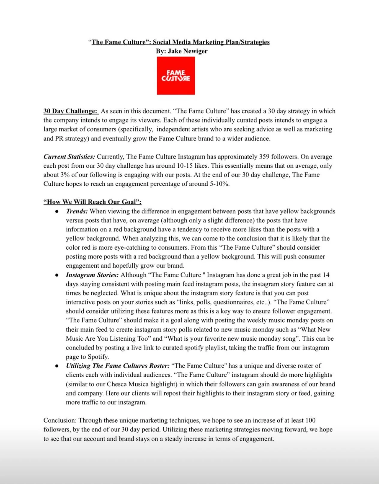 Through working as a Marketing and Public Relations intern at "The Fame Culture" I have been given the opportunity to work on marketing campaigns for their current artist roster as well as further develop my skills in social media marketing. Within this role I have been able to gain business focused knowledge of successful marketing techniques for musical artists through emphasis on highlighting an artist's unique key attributes. More specifically, I have done promotional outreach to different blogs and media outlets, research for artist development, as well as create strategic marketing plans for The Fame Culture artist roster. Aside from developing these marketing skills, I have been able to gain skills in graphic design by creating flyers, graphics, and posters for The Fame Cultures social media accounts. This position has allowed me to develop skills in outreach, communication, and promotion, furthering my ability to successfully perform in these facets of the music industry.